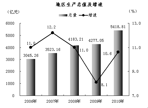初步核算,全年实现生产总值(GDP)5418.81亿元,比上年增加1141.76亿元,首次突破5000亿元大关。按可比价格计算,比上年增长10.6%,其中,第一产业增加值1078.61亿元,增长4.5%;第二产业增加值2533.69亿元,增长12.6%;第三产业增加值1806.51亿元,增长10.9%。三次产业比例为19.9︰46.8︰33.3。