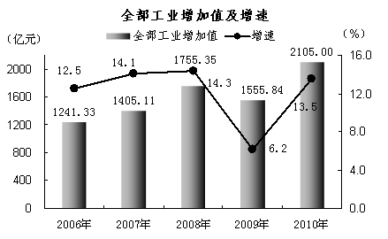 全部工业增加值2105亿元,按可比价格计算,比上年增长13.5%。