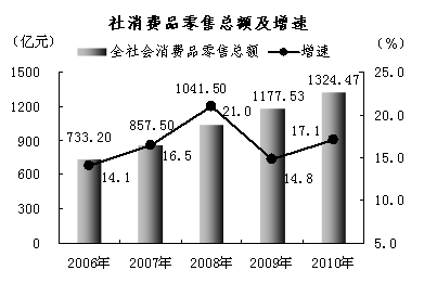 社会消费品零售总额1324.47亿元,比上年增长17.1%,扣除物价上涨因素,实际增长12.0%。