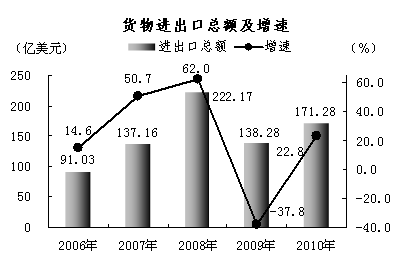 全年货物进出口总额171.28亿美元,比上年增长22.8%,其中,出口129.70亿美元,增长18.6%;进口41.58亿美元,增长38.0%。
