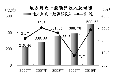 全口径财政收入1190.80亿元,比上年增长34.8%。地方财政收入693.27亿元,增长40.6%。地方财政一般预算收入500.58亿元,增长28.8%,其中,各项税收收入416.23亿元,增长38.2%。在税收收入中,国内增值税75.31亿元,增长30.7%;营业税151.27亿元,增长34.6%;资源税32.47亿元,增长1.6倍。