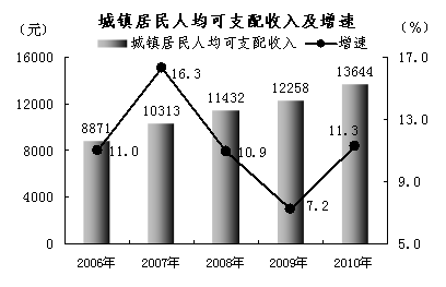 城镇居民人均可支配收入13644元,比上年增长11.3%。其中,工资性收入11328元,增长10.7%。人均消费性支出10197元,比上年增长9.3%,其中,人均食品支出3695元,增长9.1%。城镇居民家庭恩格尔系数36.2,比上年降低0.1个百分点。