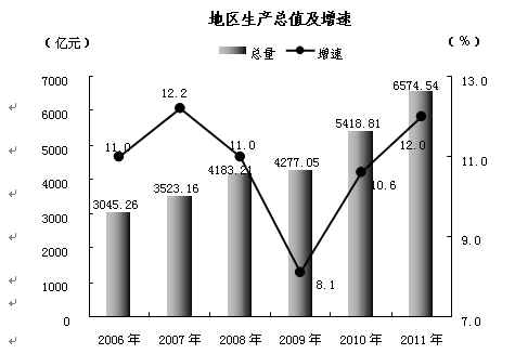 初步核算,全年实现生产总值(GDP)6574.54亿元,比上年增加1137.07亿元,突破6000亿元大关。按可比价格计算,比上年增长 12.0%。其中,第一产业增加值1139.02亿元,增长6.5%;第二产业增加值3289.84亿元,增长12.0%;第三产业增加值2145.68 亿元,增长15.2%。三次产业比例为17.3︰50.0︰32.7 。