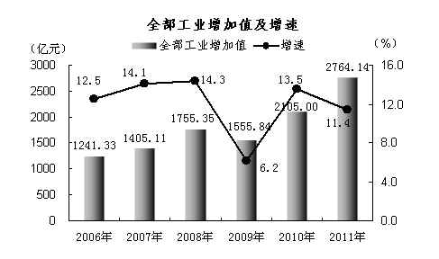 全部工业增加值2764.14亿元,按可比价格计算,比上年增长11.4%。