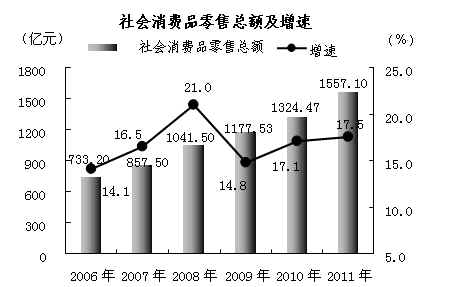 社会消费品零售总额1557.10亿元,比上年增长17.5%,扣除价格因素,实际增长11.8%。