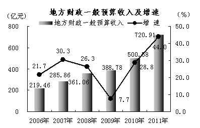 全口径财政收入1646.18亿元,增长38.2%。地方财政收入1038.80亿元,增长49.8%。地方财政一般预算收入720.91亿元,增长 44.0%,其中,各项税收收入593.36亿元,增长42.6%。在税收收入中,国内增值税96.69亿元,增长28.4%;营业税209.84亿元, 增长38.7%;企业所得税63.38亿元,增长58.4%;个人所得税38.34亿元,增长40.0%;资源税65.01亿元,增长1.0倍。