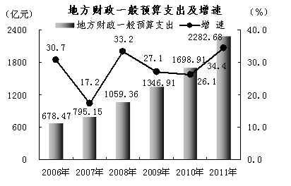 地方财政支出2598.34亿元,增长37.8%。地方财政一般预算支出2282.68亿元,增长34.4%。财政用于民生的支出1670.5亿元,占地 方财政一般预算支出的73.2%。其中,交通运输支出206.96亿元,增长1.3倍;住房保障支出170.23亿元,增长89.1%;城乡社区事务支出 139.61亿元,增长46.5%;教育支出397.15亿元,增长26.6%;医疗卫生支出132.54亿元,增长28.0%;社会保障和就业支出 199.27亿元,增长19.8%。