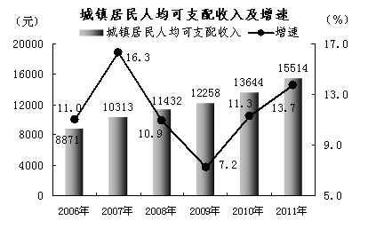 城镇居民人均可支配收入15514元,比上年增长13.7%,扣除价格因素,实际增长7.8%。其中,工资性收入12653元,增长11.7%。人均消费性支出11839元,增长16.1%,其中,人均食品支出4537元,增长22.8%。