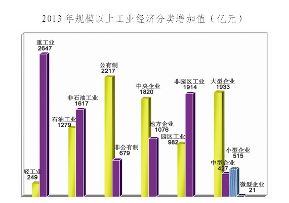 29亿元,增长46.0%;电力工业299.27亿元,增长30.5%;化学工业299.75亿元,增长15.4%;钢铁工业73.30亿元,下降2.7%;煤炭工业141.89亿元,增长5.4%;纺织工业40.18亿元,增长4.8%;农副食品加工工业52.70亿元,增长15.4%;装备制造工业83.52亿元,增长58.7%;石油工业1278.99亿元,增长5.9%;汽车工业4.03亿元,增长25.8%。