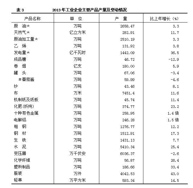 [4]表3中*产品产量为规模以上口径,其他产品为全部工业企业产品产量,原煤产量因统计渠道和口径变化,暂不公开发布2013年数据。