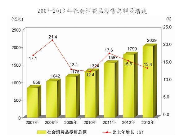 社会消费品零售总额2039.15亿元,比上年增长13.4%,扣除价格因素,实际增长9.8%。
