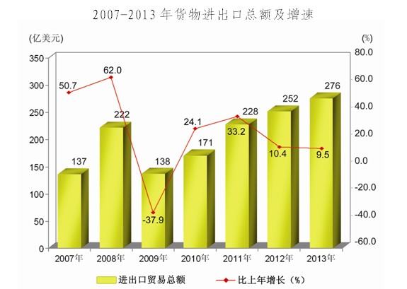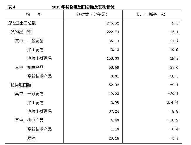货物进出口总额275.62亿美元,比上年增长9.5%。其中,出口222.70亿美元,增长15.1%;进口52.92亿美元,下降9.1%。