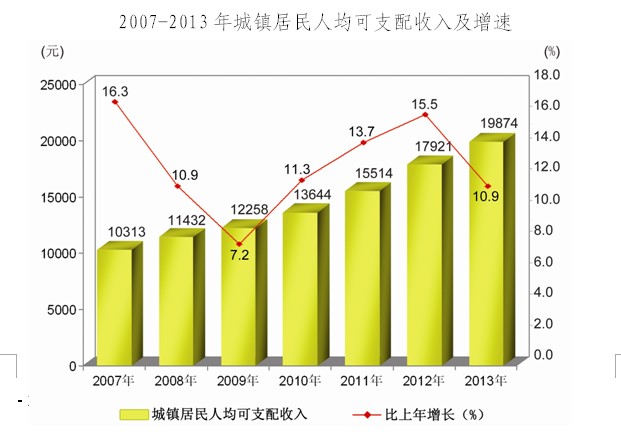 城镇居民人均可支配收入19874元,比上年增长10.9%。人均家庭总收入22388元,增长10.9%,其中,工资性收入15585元,增长8.0%;经营净收入1804元,增长10.4%;财产性收入153元,增长4.9%;转移性收入4846元,增长21.7%。人均消费性支出15206元,增长9.5%。