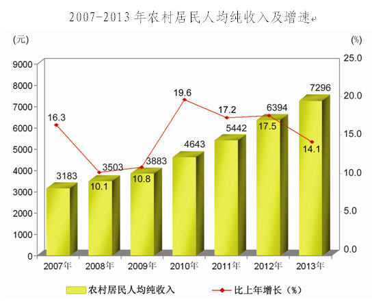 农村居民人均纯收入7296元,比上年增长14.1%,其中,工资性纯收入1312元,增长30.2%;家庭经营纯收入4654元,增长9.8%;转移性纯收入1100元,增长12.7%;财产性纯收入230元,增长34.8%。人均生活消费支出5520元,增长16.7%。
