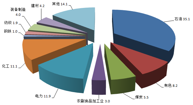 在自治区重点监测的十大产业中,石油工业增加值876.56亿元,增长0.8%;有色工业204.08亿元,增长25.7%;电力工业298.41亿元,增长10.9%;化学工业277.23亿元,下降4.4%;钢铁工业24.31亿元,下降38.5%;煤炭工业137.34亿元,增长5.3%;纺织工业47.48亿元,增长5.7%;农副食品加工工业75.22亿元,增长6.3%;装备制造工业98.77亿元,增长32.4%;建材工业103.81亿元,下降9.2%。