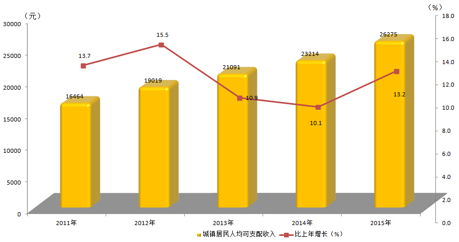 2011-2015年城镇居民人均可支配收入及增速