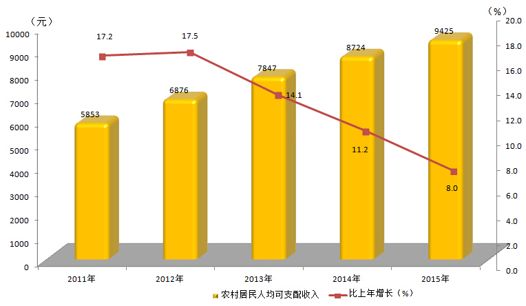 2011-2015年农村居民人均可支配收入及增速
