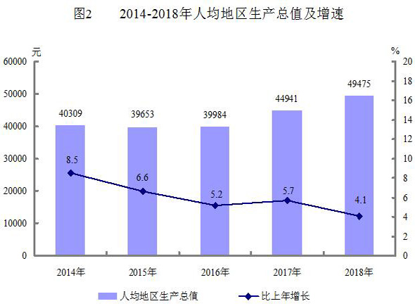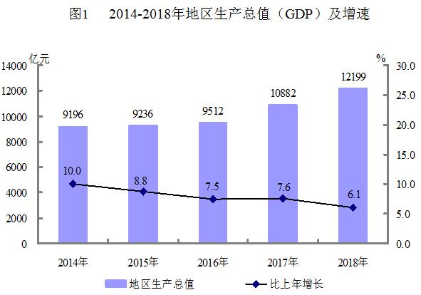 初步核算,全年实现地区生产总值 (GDP) 12199.08亿元,比上年增长6.1%。其中,第一产业增加值1692.09亿元,增长4.7%;第二产业增加值4922.97亿元,增长4.2%;第三产业增加值5584.02亿元,增长8.0%。第一产业增加值占地区生产总值的比重为13.9%,第二产业增加值比重为40.3%,第三产业增加值比重为45.8%。全年人均地区生产总值49475元,比上年增长4.1%。