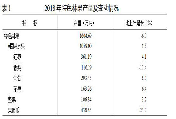 全年特色林果产量1604.69万吨,比上年减产6.7%。其中,园林水果产量1059.00万吨,增产1.8%;坚果产量106.84万吨,增产3.2%;果用瓜产量438.85万吨,减产23.7%。
