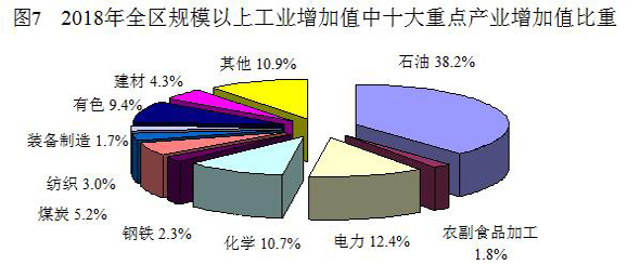 自治区重点监测的十大产业中,石油工业增加值1360.07亿元,比上年增长4.1%;有色工业334.88亿元,下降3.0%;电力工业443.44亿元,增长18.0%;化学工业382.58亿元,增长6.9%;钢铁工业81.22亿元,增长4.2%;建材工业153.00亿元,下降9.8%;煤炭工业184.96亿元,增长13.5%;纺织工业108.14亿元,增长14.5%;农副食品加工工业65.26亿元,下降15.4%;装备制造工业62.33亿元,增长2.4%。六大高耗能行业增加值增长2.9%,占规模以上工业增加值比重为54.3%。
