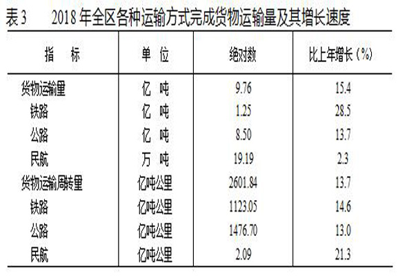 全年货物运输量9.76亿吨,比上年增长15.4%。货物运输周转量2601.84亿吨公里,增长13.7%。