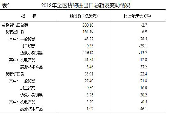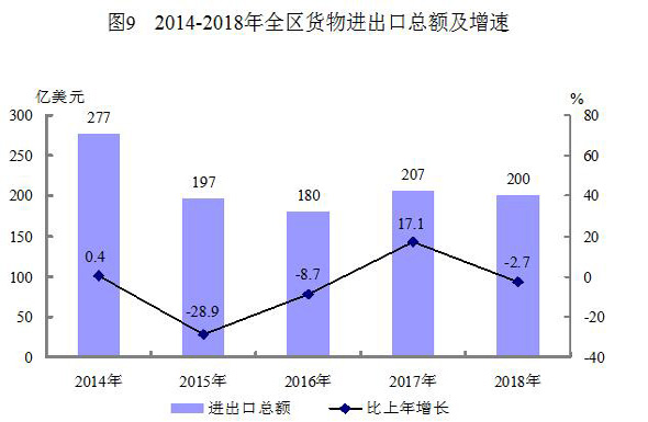 全年货物进出口总额200.10亿美元,比上年下降2.7%。其中,进口35.91亿美元,增长22.4%;出口164.19亿美元,下降6.9%。货物进出口顺差(出口减进口)128.28亿美元,比上年减少19.70亿美元。